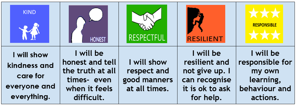 To support our children in becoming confident citizens, our teaching and learning is underpinned by our five core values of kindness, responsibility, honesty, resilience and respect. These values are interwoven throughout our entire curriculum and you will see any member of our community modelling them daily when you are in school. Everyone is expected to demonstrate these values in their learning and social interactions with any peers, parents or staff.